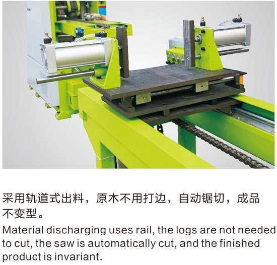 采用軌道式出料,原木不用打邊,自動鋸切,成品不變型